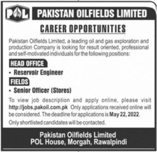 Pakistan Oilfields Ltd jobs advertisement dated about 15 May 2022 in daily Jang Newspaper invites application for the vacant post of officer stores and reservoir engineer in Rawalpindi, rawalpindi Punjab Pakistan. Preferred Education is Master and Bachelor etc.