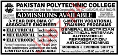 Pakistan Polytechnic College has announced admissions for diploma & courses in Electrical Technology, Mechanical Technology, Electronic Technology, General Electrician, Electrical Wire Man, Automobile, Refrigeration and Air Conditioning in Karachi. Read newspaper ad for exact details.