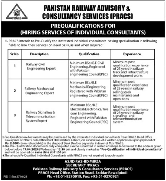 Pakistan Railway Advisory and Consultancy Services PRACS latest Government Engineering jobs and others can be applied till April 17, 2024 or as per closing date in newspaper ad. Read complete ad online to know how to apply on latest Pakistan Railway Advisory and Consultancy Services PRACS job opportunities.