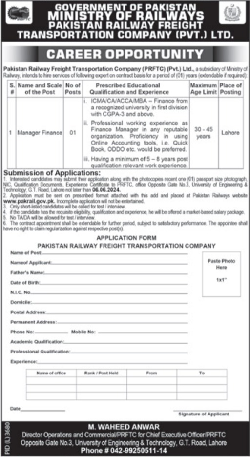 Pakistan Railways Lahore, lahore Punjab Pakistan invites applications from eligible candidates for the post of manager finance as per advertisement of May 23, 2024 published in daily Khabrain Newspaper. Persons with ACCA, CA and MBA etc. education can apply.