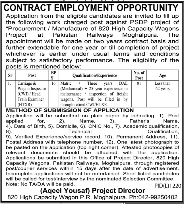 Pakistan Railways Lahore Jobs 2021 For Wagon Inspector