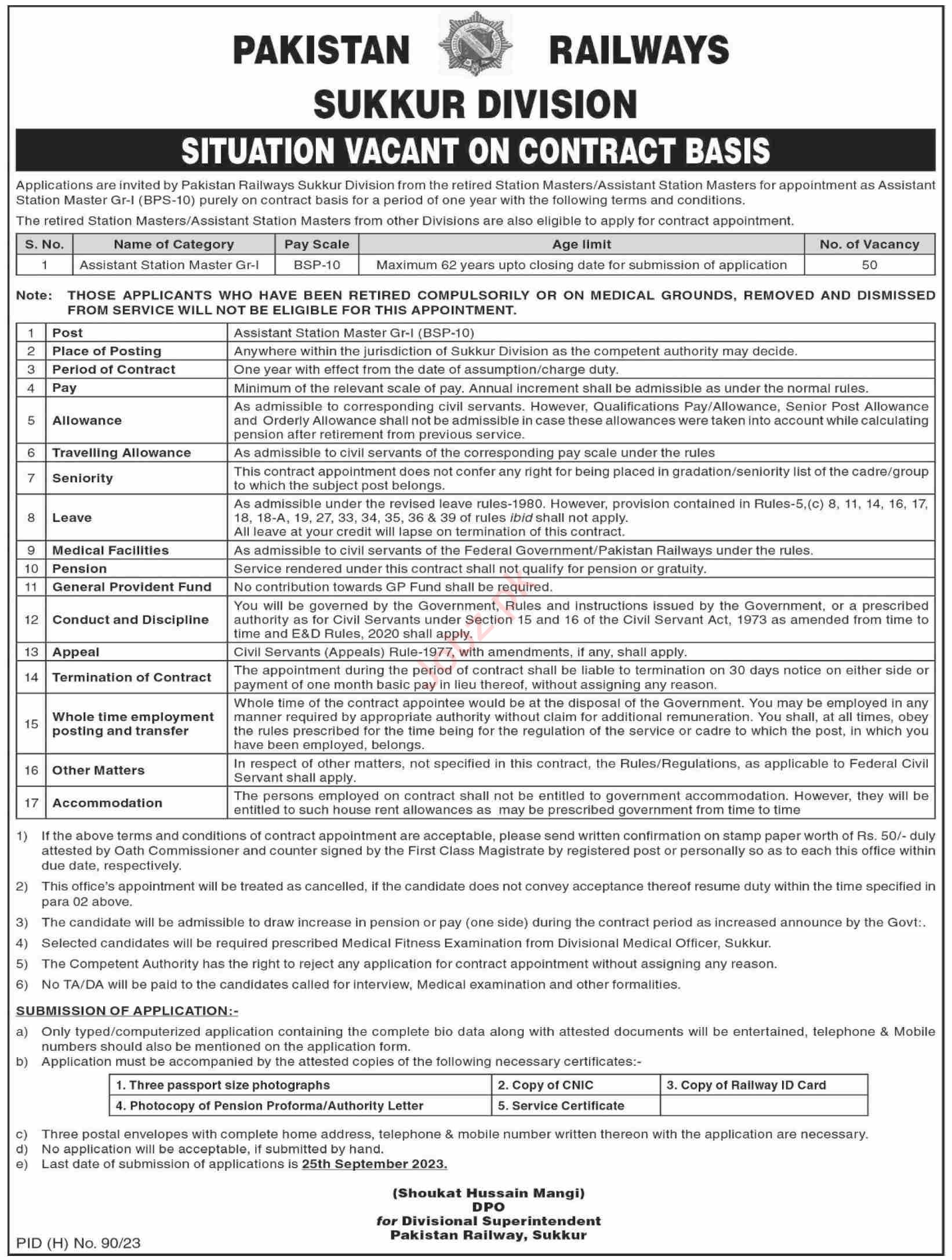 Vacant posts including assistant station master are announced in Pakistan Railways Sukkur, sukkur Sindh Pakistan as per 3 September 2023 advertisement in daily Dawn Newspaper. Educational qualifications required Bachelor and Intermediate etc.