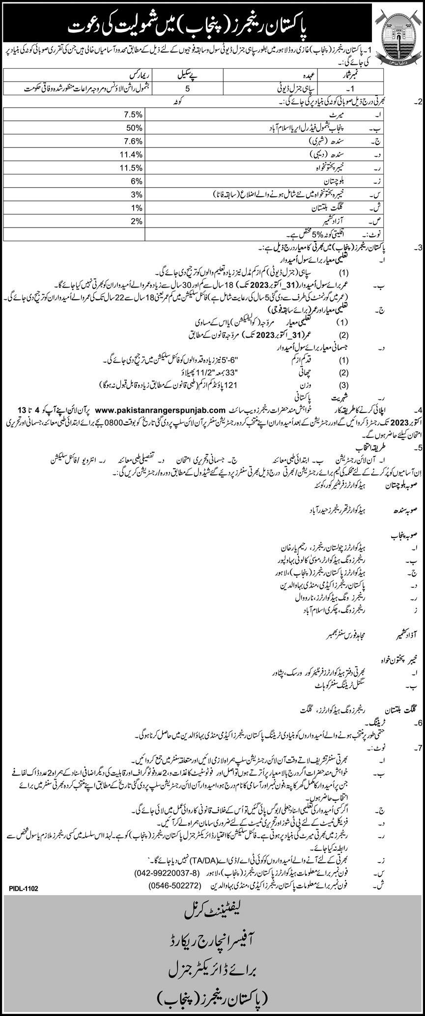 Vacancies in Pakistan Rangers Advertisement October 2023