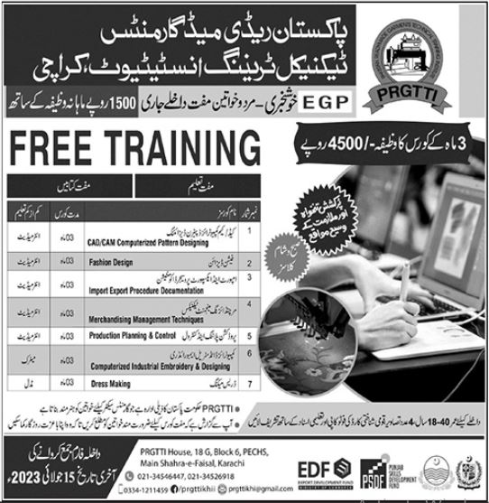 Pakistan Ready Made Garments Technical Training Institute Free Technical Training Course in Cad CAM Computerized Pattern Designing, Import & Export procedure Documentation, Production Planning & Control, Computerized Industrial Embroidery, Merchandising Management Techniques, Dress Making admissions 2023 has been started. Students who want to take admissions in Pakistan Ready Made Garments Technical Training Institute Karachi Sindh Pakistan for academic year 2023 to continue education in Technical Course can apply. Students for admissions in Diploma and Course & criteria can apply as per Government institute admission policy 2023 before closing date July 15, 2023 as per advertisement. Read newspaper ad for exact details.