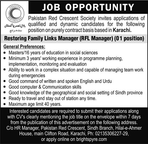 Pakistan Red Crecent Society jobs advertisement dated about 1 September 2023 in daily Kawish Newspaper invites application for the vacant post of restoring family links manager and rfl manager in Karachi, karachi Sindh Pakistan. Preferred Education is Bachelor, Master and MS etc.
