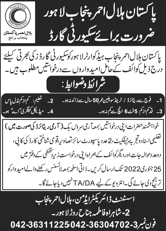 Pakistan Red Crescent PRC latest Government Security jobs and others can be applied till January 25, 2022 or as per closing date in newspaper ad. Read complete ad online to know how to apply on latest Pakistan Red Crescent PRC job opportunities.