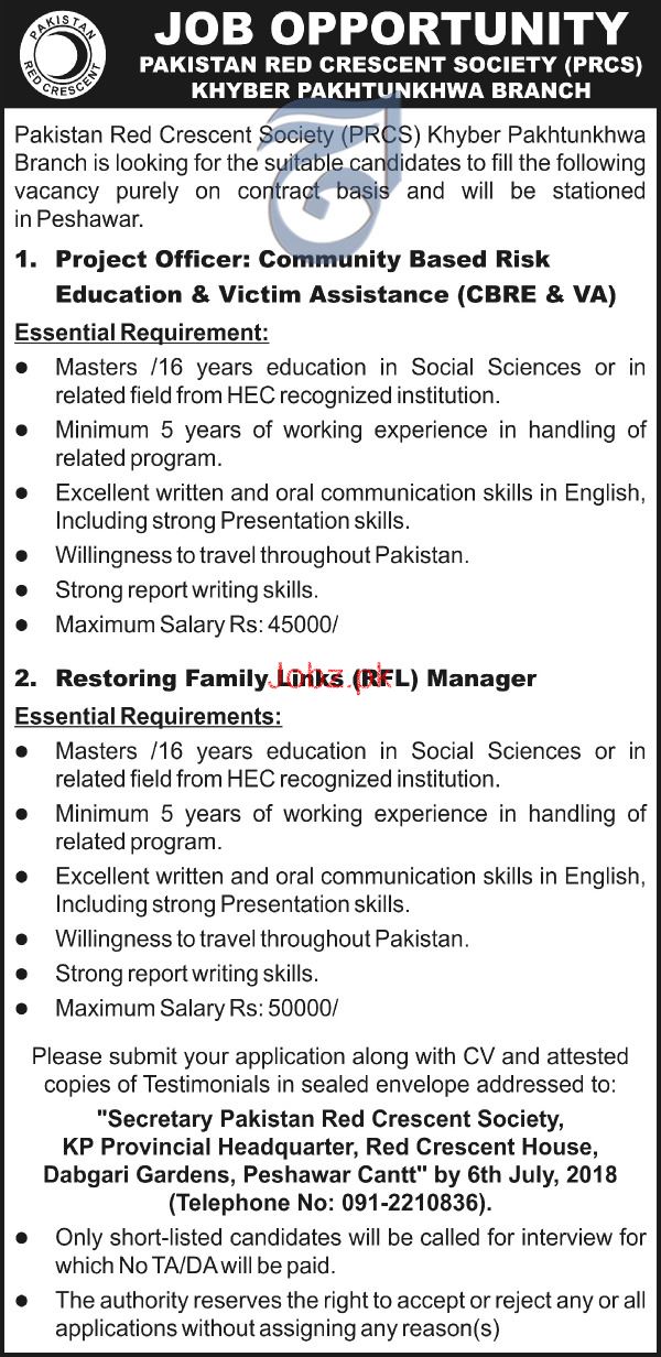 Latest Pakistan Red Crescent PRC Management Posts Peshawar 2025