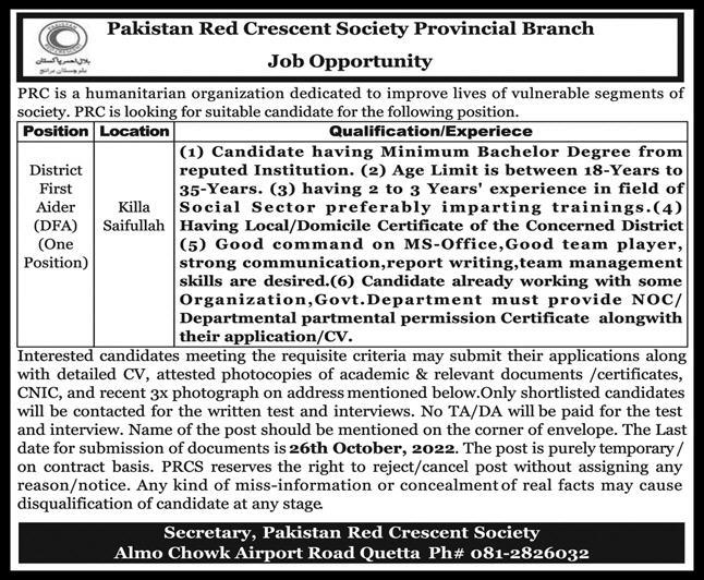 Vacant posts including district first aider and dfa are announced in Pakistan Red Crescent Society PRCS Quetta, quetta Balochistan Pakistan as per 19 October 2022 advertisement in daily Express Newspaper. Persons with Bachelor etc. education can apply.