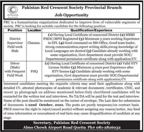 Pakistan Red Crescent Society PRCS Quetta, quetta Balochistan Pakistan invites applications from eligible candidates for the post of driver and district supervisor field work male as per advertisement of October 12, 2022 published in daily Jang Newspaper. Preferred Education is Intermediate, Matric, Middle and Bachelor etc.