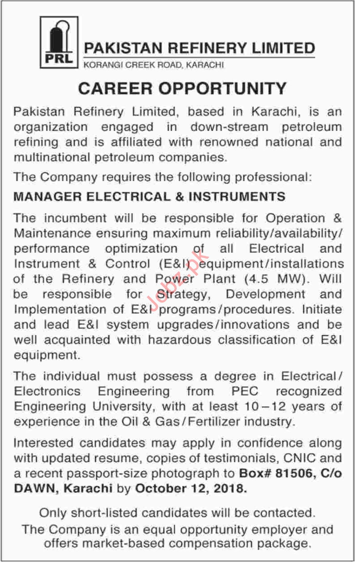 Pakistan Refinery Ltd Manager Electrical And Instruments Job