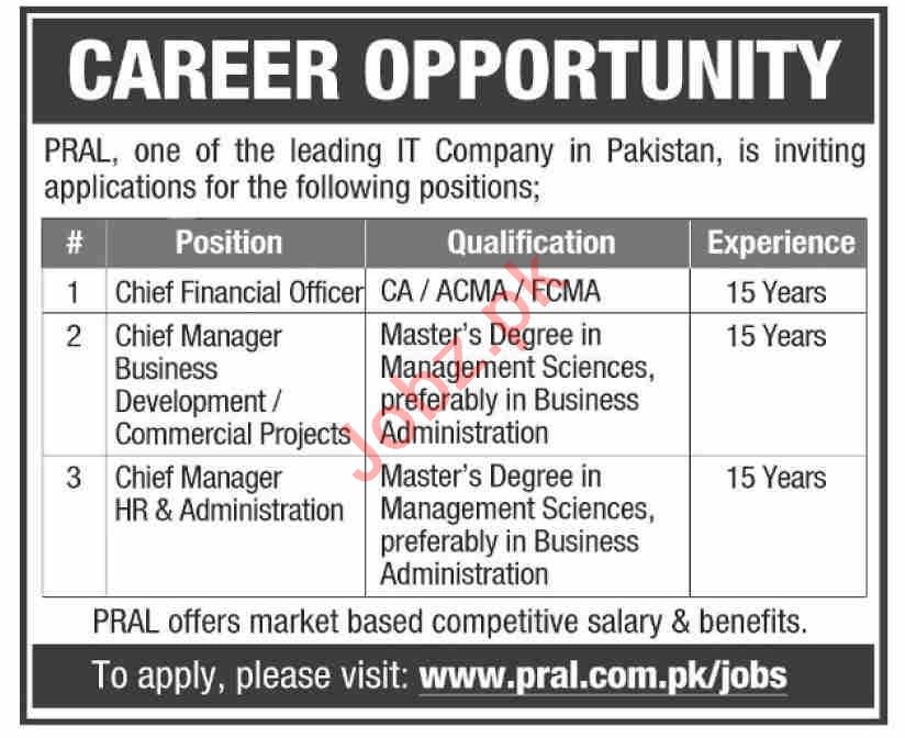 Pakistan Revenue Automation Limited PRAL Islamabad, Pakistan is looking for the services from experienced candidates for the posts of Chief Financial Officer, CEO, Chief Manager Business Development, Chief Manager Commercial Projects, Chief Manager HR, Chief Manager Administration.