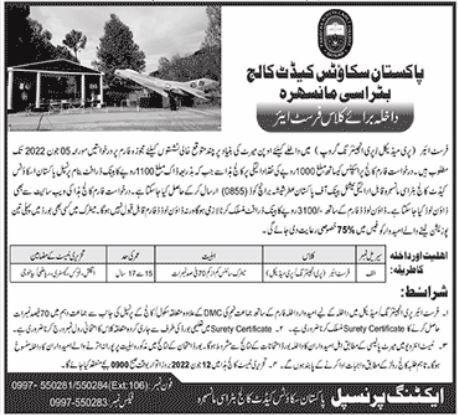 Admissions in Pakistan Scouts Cadet College 2022 for Pre Medical, Pre Engineering has been announced. Students who want to take admissions in Pakistan Scouts Cadet College Mansehra Khyber Pakhtunkhwa KPK Pakistan for academic year 2022 to continue education in Teaching College can apply. Students who want to enroll for academic session 2022 in Intermediate qualification and admission criteria for Government institute can apply till last date 5 June 2022. Read newspaper ad for exact details.