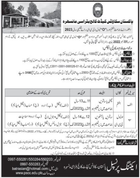 Pakistan Scouts Cadet College O Level Admissions. admissions 2022 has been announced. Eligible students can apply for academic admissions 2022 in Pakistan Scouts Cadet College Mansehra Khyber Pakhtunkhwa KPK Pakistan for Teaching College. Eligible candidates for admissions in Intermediate can apply as per Government institute criteria and before closing date 1 December 2022 after reading advertisement online. Read newspaper ad for exact details.