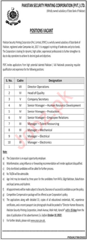 Pakistan Security Printing Corporation Pvt Ltd Karachi, karachi Sindh Pakistan invites applications from eligible candidates for the post of company secretary, manager mechanical, manager talent resourcing, head of quality, manager electronics, manager electrical, manager hrd, manager production, manager employee relations and director operatoins as per advertisement of September 25, 2022 published in daily Jang Newspaper. Preferred Education is Master, Bachelor, Intermediate and DAE etc.