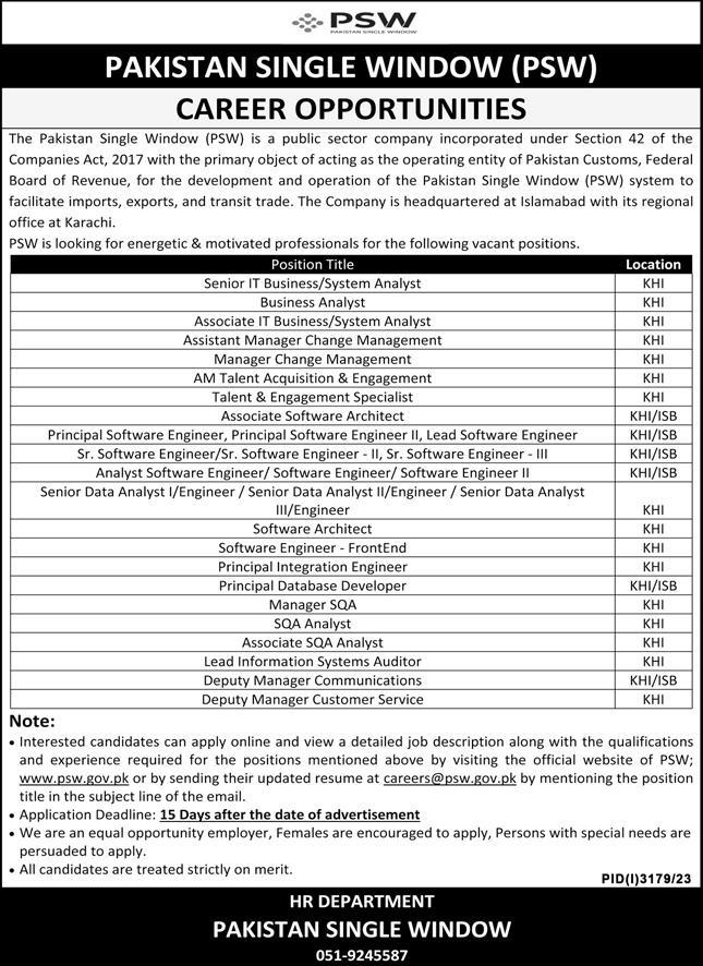 Pakistan Single Window PSW jobs advertisement dated about 24 November 2023 in daily Express Newspaper invites application for the vacant post of it business analyst, data engineer bi, lead software engineer, system analyst, technical project manager, engineer, talent engagement specialist, data analyst iii, principal data analyst, deputy manager customer service, associate software architect, am talent acquisition engagement, principal software engineer ii, analyst software engineer, principal integration engineer, data analyst ii, business analyst, software developer php, associate systems engineer support, associate it business analyst, sqa analyst, data analyst i, principal data analyst ii, sqa analyst ii, product owner, project manager, sqa analyst iii, deputy manager communications, manager change management, manager people services, software engineer, application security lead, software engineer ii, software engineer iii, software architect, assistant manager change management, integration engineer, lead data analyst, systems engineer, principal software engineer, network infrastructure security lead, security operations lead and principal database developer in Islamabad, karachi Islamabad Pakistan. Preferred Education is MCS, MS, BIT, BCS, MIT, Intermediate, Bachelor, Others, DAE and M.sc etc.