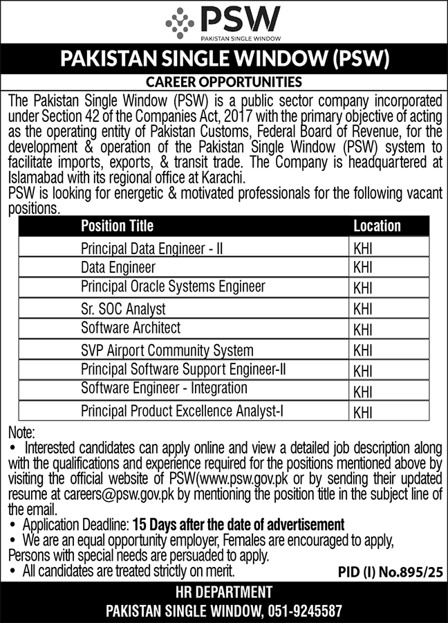 Pakistan Single Window PSW is looking for candidates for following posts as per job advertisement published in daily Nawaiwaqt Newspaper of August 2, 2025 for location Karachi, karachi Sindh Pakistan: