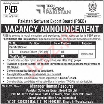 Vacant posts including finance officer are announced in Pakistan Software Export Board PSEB Islamabad, islamabad Islamabad Pakistan as per 16 June 2024 advertisement in daily Jang Newspaper. Preferred Education is Master, MS and Bachelor etc.