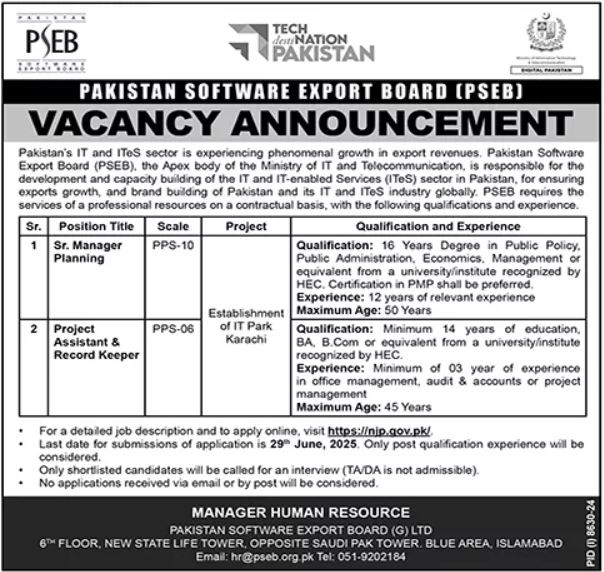 Vacant posts including project assistant, manager planning and project record keeper are announced in Pakistan Software Export Board PSEB Islamabad, islamabad Islamabad Pakistan as per 13 June 2025 advertisement in daily Dunya Newspaper. Persons with MS, Master and Bachelor etc. education can apply.