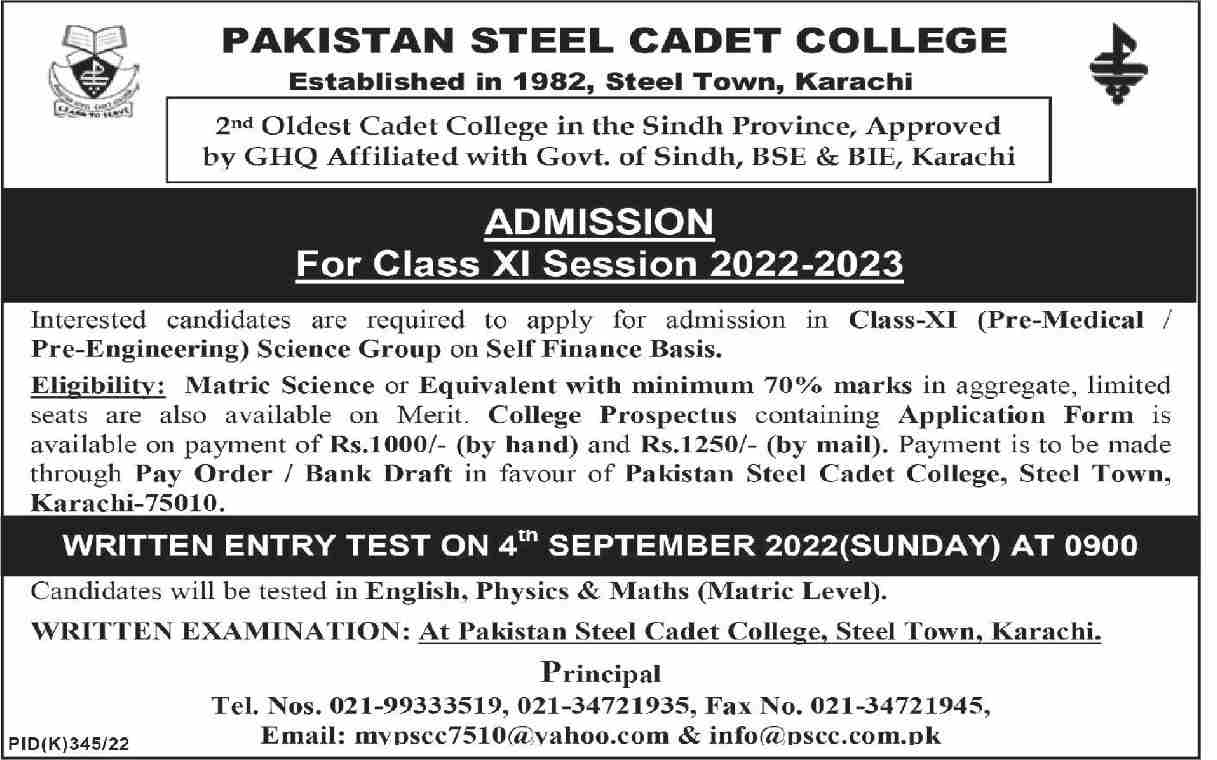 Admissions in Pakistan Steel Cadet College 2022 for Intermediate part I, Calss XI, 11th Class, Fsc Pre Engineering, FSc Pre Medical on Self Finance Basis has been announced. Eligible students who qualify as per admission criteria in Pakistan Steel Cadet College Karachi Sindh Pakistan can apply in Science College for academic year 2022. Eligible students for fulfilling criteria for admissions in Intermediate can enroll as per Government admission policy 2022 till closing date 4 September 2022. Read newspaper ad for exact details.