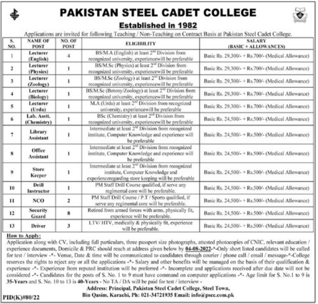 Pakistan Steel Cadet College Karachi, karachi Sindh Pakistan invites applications from eligible candidates for the post of english lecturer, nco, office assistant, lecturer urdu, store keeper, lecturer physics, lecturer biology, security guard, lab assistant, drill instructor, lecturer zoology and driver as per advertisement of July 17, 2022 published in daily Ausaf Newspaper. Educational qualifications required Bachelor, Master, Middle, MS, M.sc, MA and Matric etc.