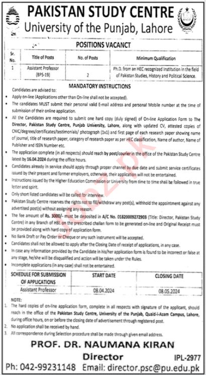 University of Punjab UOP invites applications for job positions advertised in daily Jang dated 7 April 2024 for following vacancies in Lahore, lahore Punjab Pakistan.