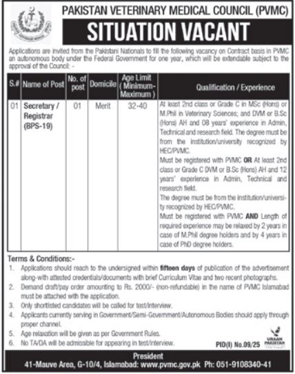 Pakistan Veterinary Medical Council jobs advertisement dated about 3 July 2025 in daily Khabrain Newspaper invites application for the vacant post of registrar in G-10/4 Islamabad, islamabad Islamabad Pakistan. Persons with Others and M.sc etc. education can apply.