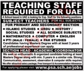 Pakistani School Ajman PSA is looking for candidates for following posts as per job advertisement published in daily Jang Newspaper of October 22, 2023 for location UAE, uae UAE: