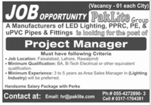 Paklite Group Lahore, faisalabad and rawalpindi Punjab Pakistan invites applications from eligible candidates for the post of project manager as per advertisement of April 17, 2022 published in daily Jang Newspaper. Educational qualifications required Bachelor and BA etc.