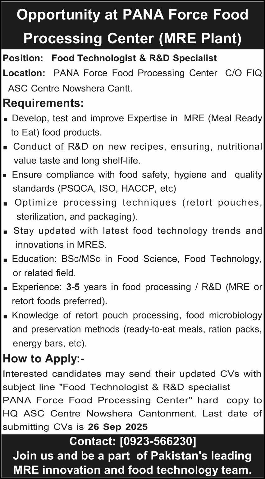 PANA Force Food Processing Center Nowshera, nowshera Khyber Pakhtunkhwa KPK Pakistan invites applications from eligible candidates for the post of food technologist and rd specialist as per advertisement of September 11, 2025 published in daily Other Newspaper. Preferred Education is Master, Bachelor and MS etc.
