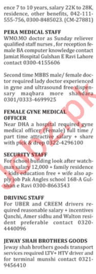 ENT Specialist, Eye Specialist, Child Specialist, MBBS Medical Officer, Radiologist, Staff Nurse, LHV, Doctor, Lady Doctor, Technicians, Pharmacist, Midwives, Gynecologist, Receptionist, Dispensers, Lab Technicians, Driver, LTV Driver, HTV Driver, Deliveryman and House Driver seeks in well reputed hospital.