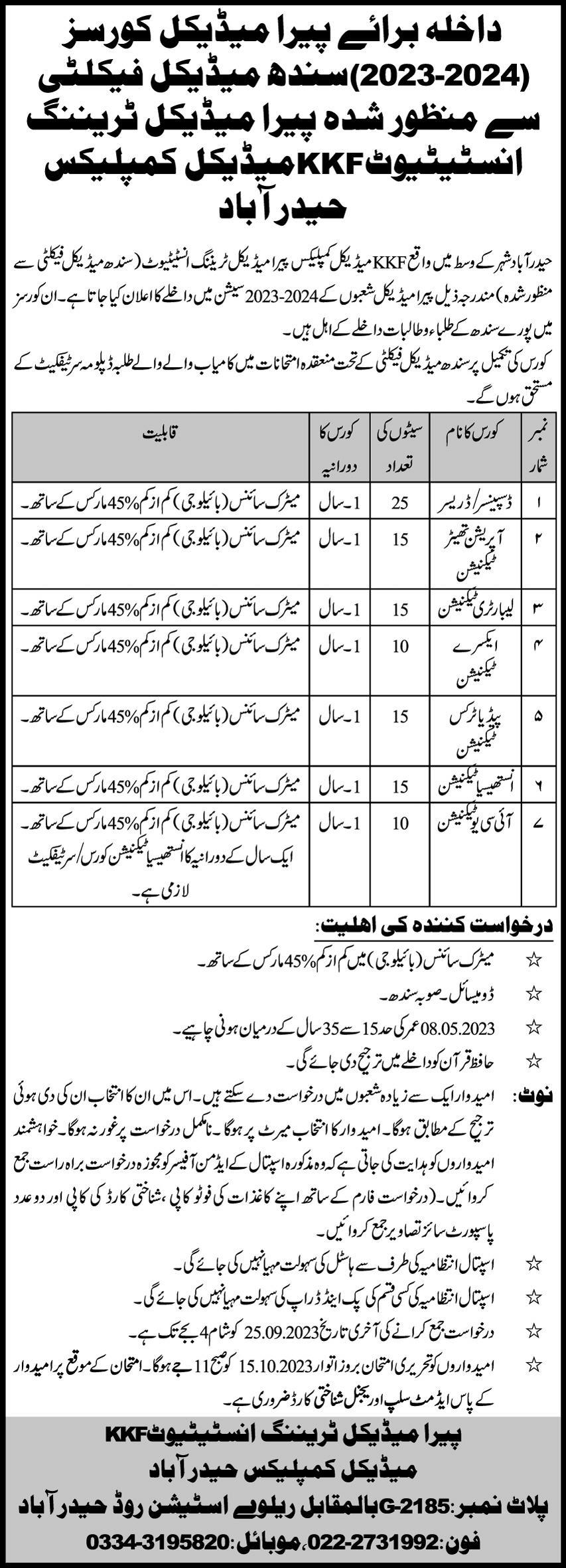 Paramedical Institute admissions 2023 for Paramedical Training Course of Dispenser, Dresser, Operations Theater Technician, Laboratory Technician, X ray Technician, Pediatrics Technician, ICU Technician has been announced. Students who want to take admissions in Paramedical Institute Hyderabad Sindh Pakistan for academic year 2023 to continue education in Medical Medical College can apply. Eligible students for fulfilling criteria for admissions in Course and Diploma can enroll as per Government admission policy 2023 till closing date 25 September 2023. Read newspaper ad for exact details.