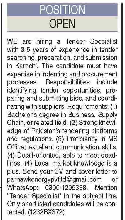 Vacant posts including tender specialist are announced in Parhawk Energy DHA Defence Karachi, karachi Sindh Pakistan as per 17 April 2025 advertisement in daily Dawn Newspaper. Bachelor and Intermediate etc. educational qualification will be preferred.