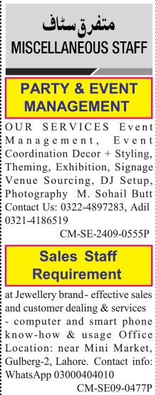 Party Event Management & Sales Staff Jobs 2024 In Lahore