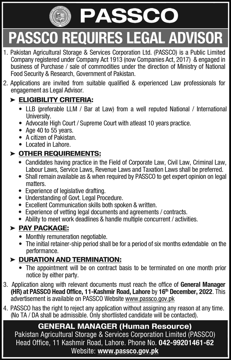 Apply at Pakistan Agricultural Storage & Services Corporation Limited PASSCO latest Government jobs in Legal and departments before closing date which is around December 16, 2022 or as per closing date in newspaper ad. Read complete ad online to know how to apply on latest Pakistan Agricultural Storage & Services Corporation Limited PASSCO job opportunities.
