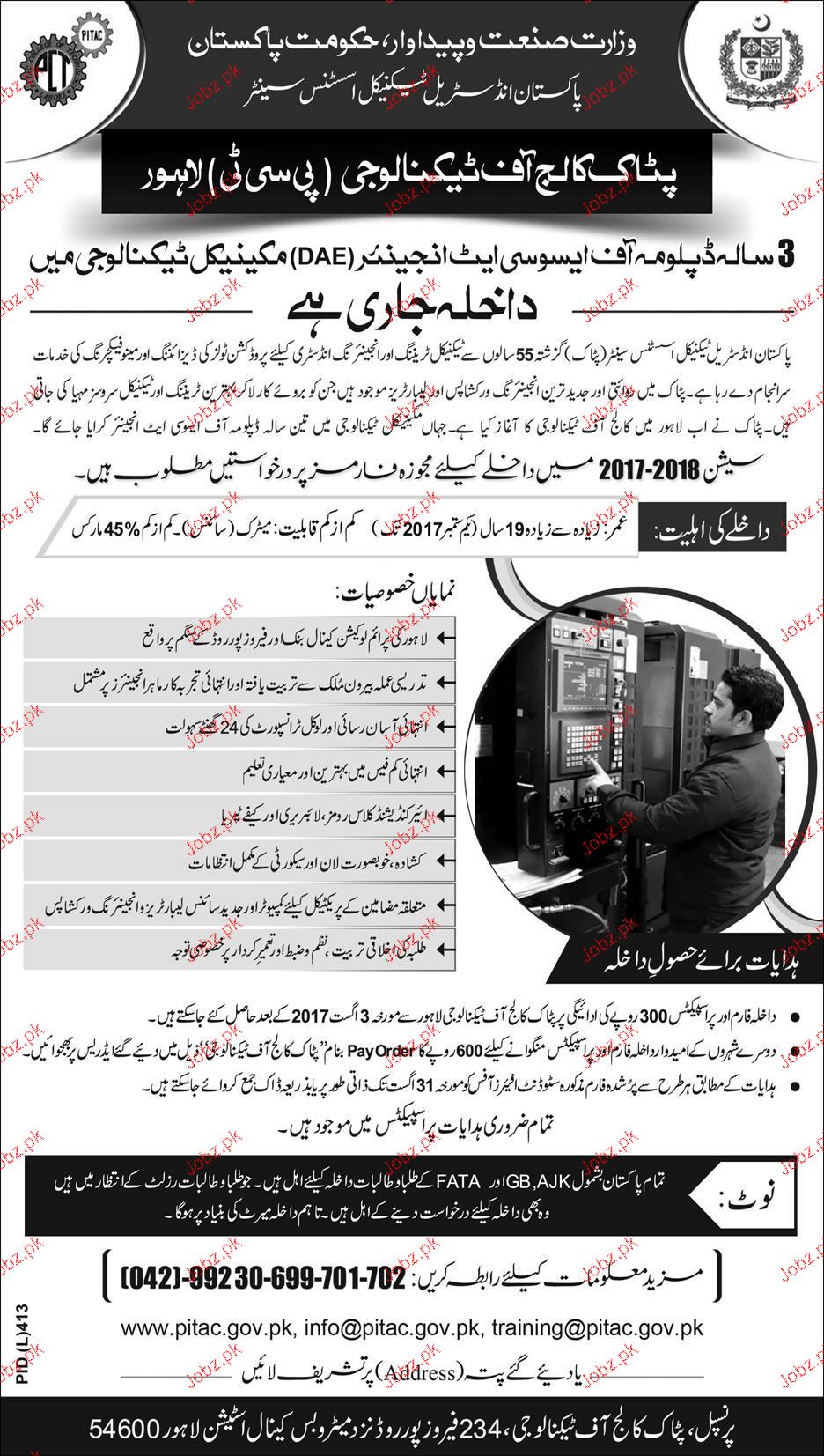 Patak College of Technology Admission in DAE in Lahore. Read newspaper ad for exact details.
