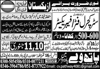 Vacant posts including fabricator and structure fitter are announced in Pathway Manpower Services Tashkent, tashkent Uzbekistan as per 10 January 2024 advertisement in daily Express Newspaper. Educational qualifications required Primary, Matric and Middle etc.