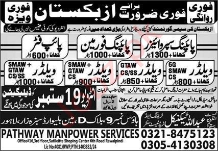 Vacant posts including Welder, Piping Supervisor, Smaw Welder, Gtaw Welder, Piping Foreman and Pipe Fitter are announced in Pathway Manpower Services Tashkent, tashkent Uzbekistan as per 16 September 2024 advertisement in daily Express Newspaper. Educational qualifications required Matric, Middle and Primary etc.