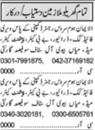 House jobs advertisement dated about 10 April 2025 in daily Khabrain Newspaper invites application for the vacant post of cook, husband wife, maid, driver, baby care and patient care in Lahore, lahore Punjab Pakistan. Middle, Primary and Matric etc. educational qualification will be preferred.