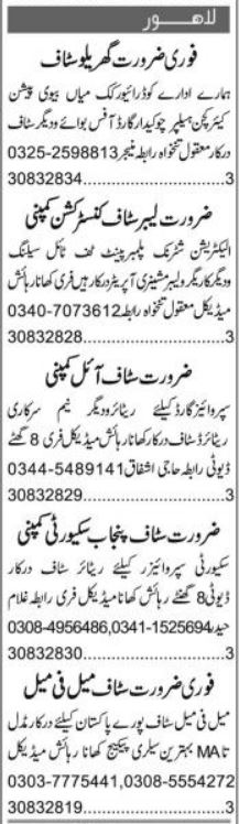 Private Company jobs advertisement dated about 1 November 2022 in daily Express Newspaper invites application for the vacant post of ltv driver, shuttering carpenter, driver, patient care, cook, supervisor guard, office boy, office staff, plumber, kitchen helper, chowkidar, husband wife, electrician, guard, security supervisor and machinery operator in Lahore, lahore Punjab Pakistan. Candidates with Middle, Intermediate, Matric and Bachelor etc. educational background will be preferred.