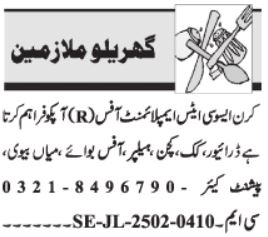House jobs advertisement dated about 13 February 2025 in daily Jang Newspaper invites application for the vacant post of driver, cook, office boy, husband wife, kitchen helper and patient care in Lalamusa, lahore Punjab Pakistan. Educational qualifications required Matric, Primary and Middle etc.