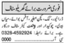 House Lahore, lahore Punjab Pakistan invites applications from eligible candidates for the post of driver, chowkidar, cook, kitchen helper, office boy, patient care and husband wife as per advertisement of June 19, 2025 published in daily Khabrain Newspaper. Candidates with Matric, Middle and Primary etc. educational background will be preferred.