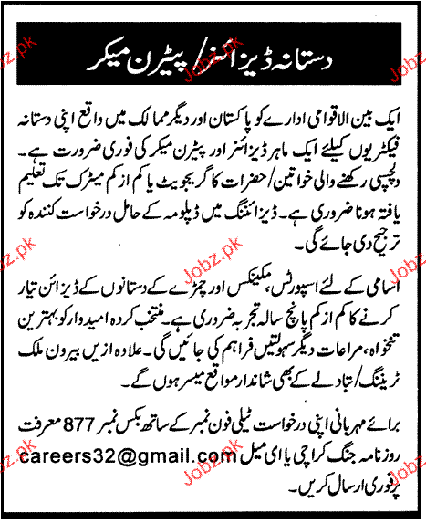 Apply as per details in job advertisement. Login to view further details of how to apply via https://www.jobz.pk online.