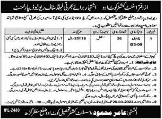 Revenue Department jobs advertisement dated about 11 March 2022 in daily Dunya Newspaper invites application for the vacant post of patwari in Muzaffargarh, muzaffargarh Punjab Pakistan. Educational qualifications required Intermediate etc.