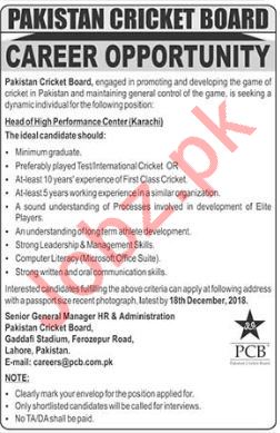 Vacancies in Pakistan Cricket Board PCB Advertisement December 2018