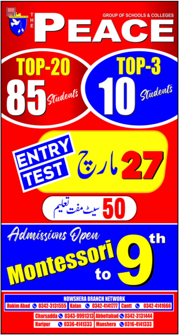Admissions in Peace Group of Schools & Colleges 2022 for Montessori to 9th Class has been announced. Eligible students who qualify as per admission criteria in Peace Group of Schools & Colleges Nowshera Khyber Pakhtunkhwa KPK Pakistan can apply in Other School for academic year 2022. Students for admissions in Primary, Matric and Middle can apply for online or campus classes as per Private institute criteria till admission closing date March 27, 2022. Read newspaper ad for exact details.