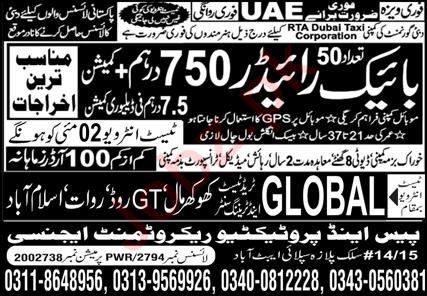 Vacant posts including bike rider are announced in Peace & Protective Recruitment Agency Abu Dhabi, abu dhabi UAE as per 29 April 2024 advertisement in daily Express Newspaper. Candidates with Middle, Matric and Primary etc. educational background will be preferred.