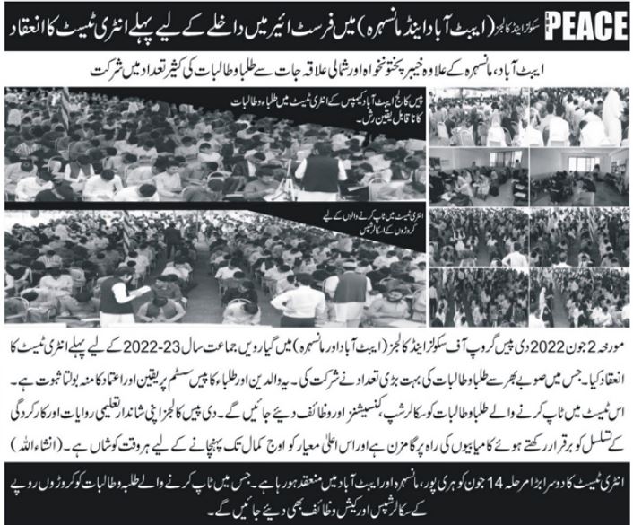 Admissions in PEACE School and College 2022 for Pre Medical, Pre Engineering, Computer Sciences has been announced. Eligible students can apply for academic admissions 2022 in PEACE School and College Abbottabad Haripur and Mansehra Khyber Pakhtunkhwa KPK Pakistan for Teaching College. Students for admissions in Intermediate & criteria can apply as per Private institute admission policy 2022 before closing date June 14, 2022 as per advertisement. Read newspaper ad for exact details.