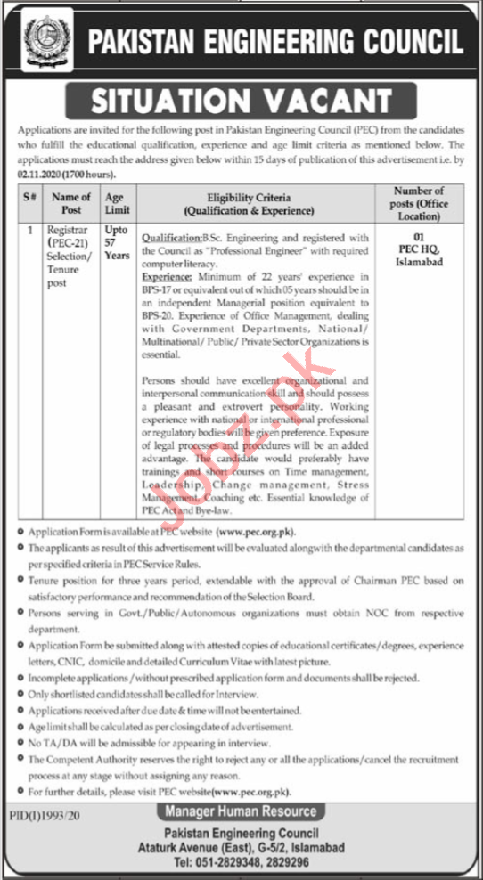 PEC Islamabad Jobs 2020 for Registrar & Registrar Selection