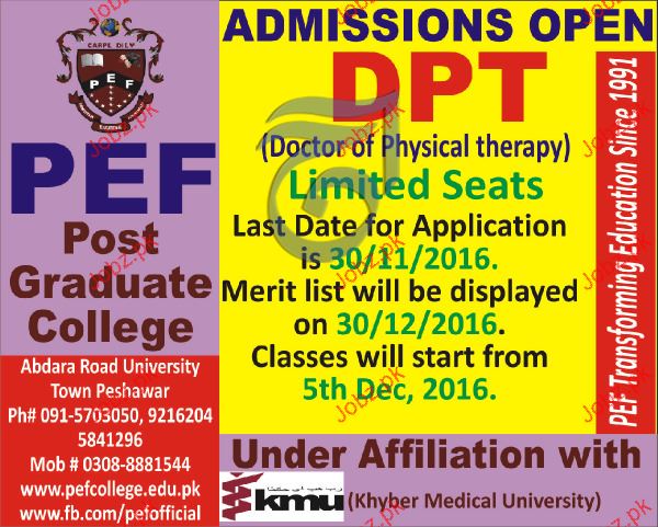 PEF Postgraduate College Admission in DPT in Peshawar. Read newspaper ad for exact details.