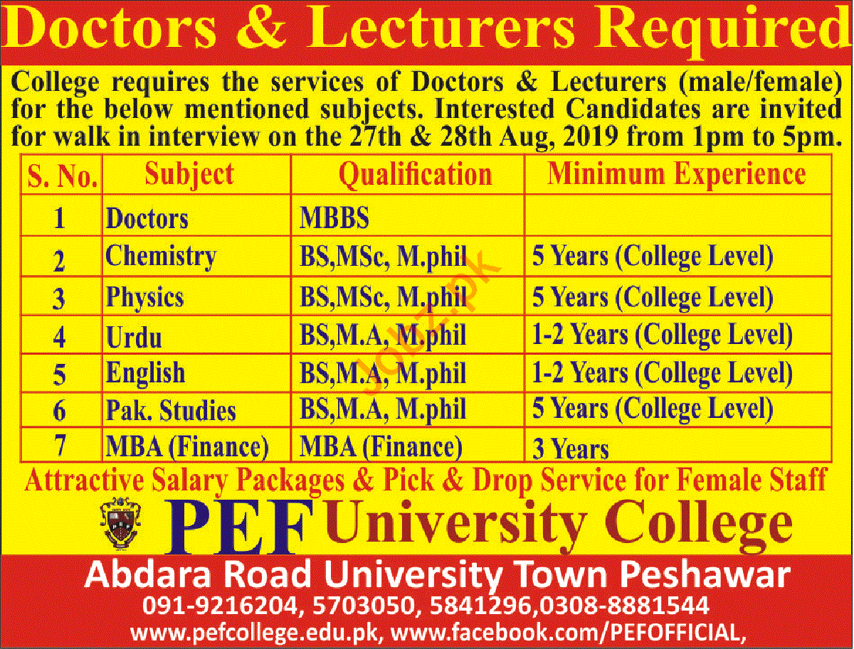 PEF University College invites applications from medical, health, mbbs, highly qualified and experienced candidates for the positions of Doctors, Chemistry Lecturer, Physics Lecturer, Urdu Lecturer, English Lecturer and Pakistan Studies Lecturer in Peshawar KPK 2019.